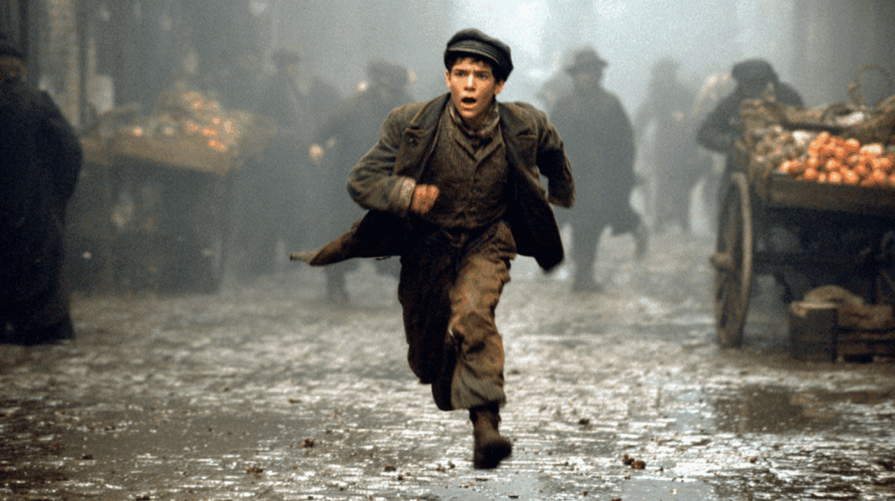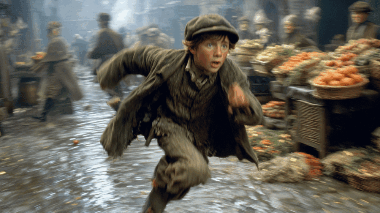 Durante la llegada a Londres la psicología del niño aparece en cada movimiento. Oliver se detiene ante escaparates, observa las luces de las tiendas y sigue con la mirada a los grupos que conversan en las esquinas. Sus ojos recorren carros que avanzan por la calle y pasan de un vendedor ambulante a un perro que cruza la calzada. Esa manera de fijarse en detalles evidencia un rasgo constante: interpreta el entorno a partir de lo que ve, lo que oye y lo que siente en el cuerpo cuando las calles cambian de ritmo.