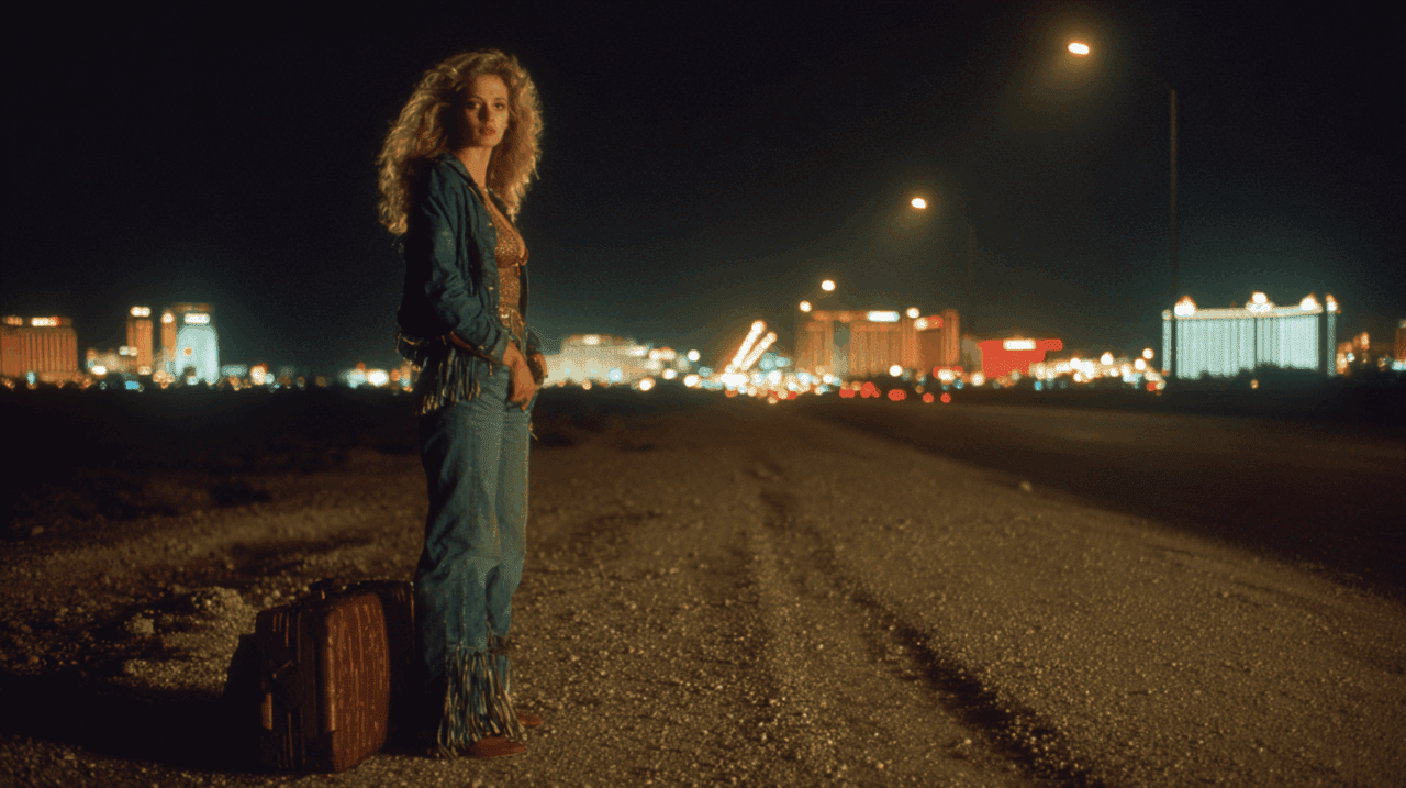 La escena final muestra a Nomi haciendo autostop de nuevo en la frontera del desierto, cerrando su historia con una simetría visual perfecta respecto al inicio. Ahora se dirige a Los Ángeles, pero esta vez lleva consigo la experiencia de haber sobrevivido al sistema y haberlo rechazado desde dentro. Su partida no es una derrota, sino una liberación consciente de las cadenas del éxito artificial, recuperando su nombre y su libertad en la carretera abierta.